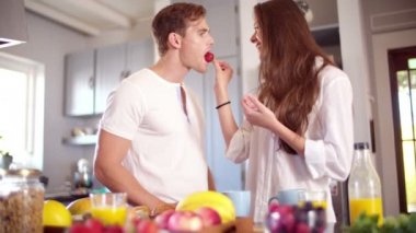 Deux lesbiennes dans la cuisine, une fille de son amie l’alimentation avec des boulettes ...