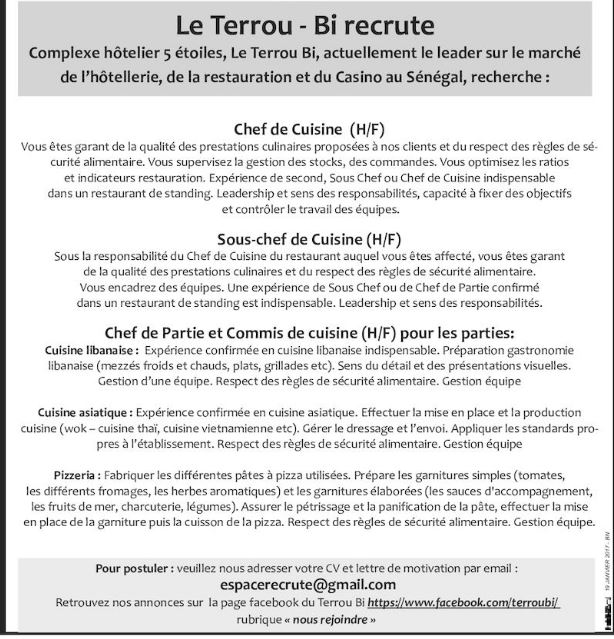 Chef de cuisine au Sénégal, Emploi de chef de cuisine au Sénégal